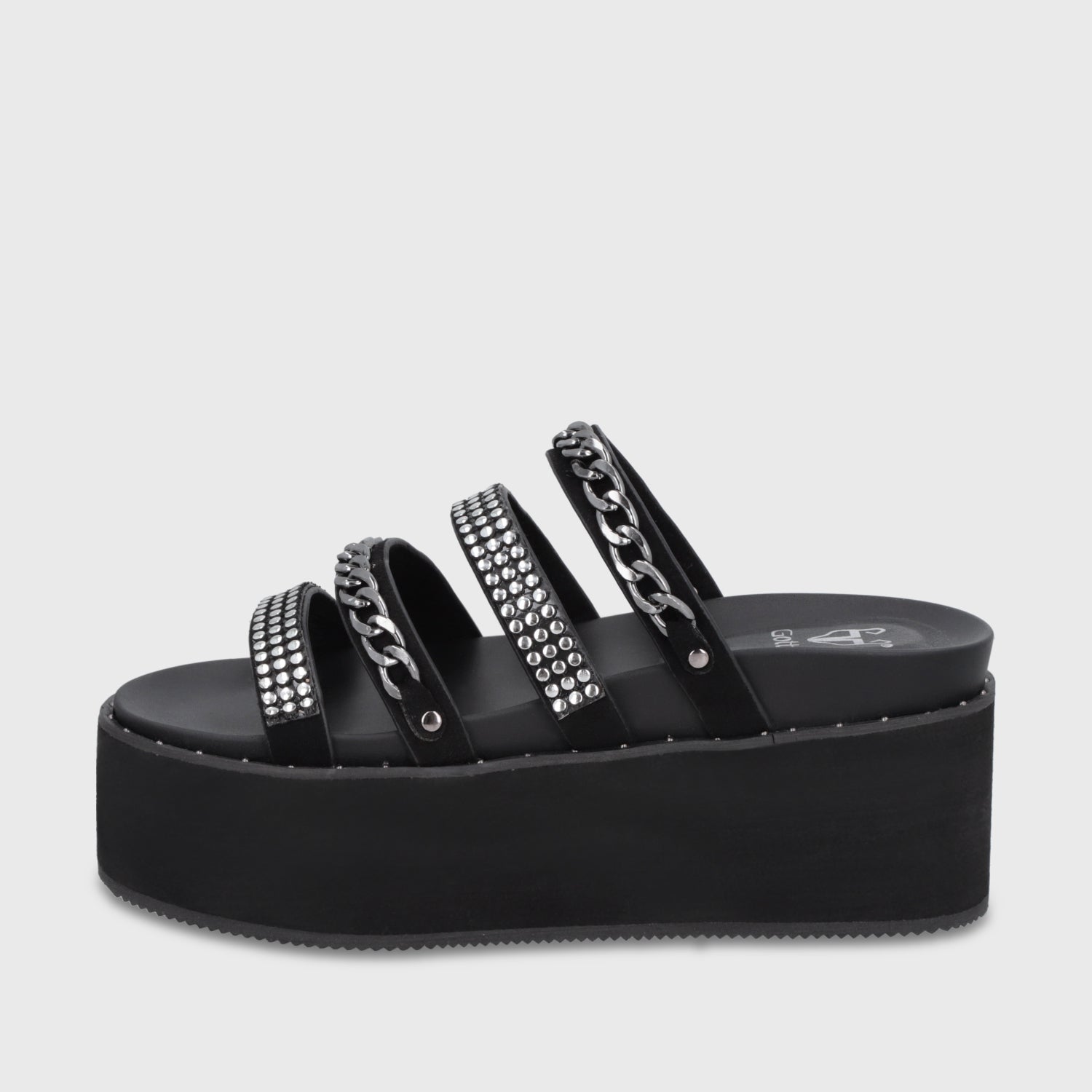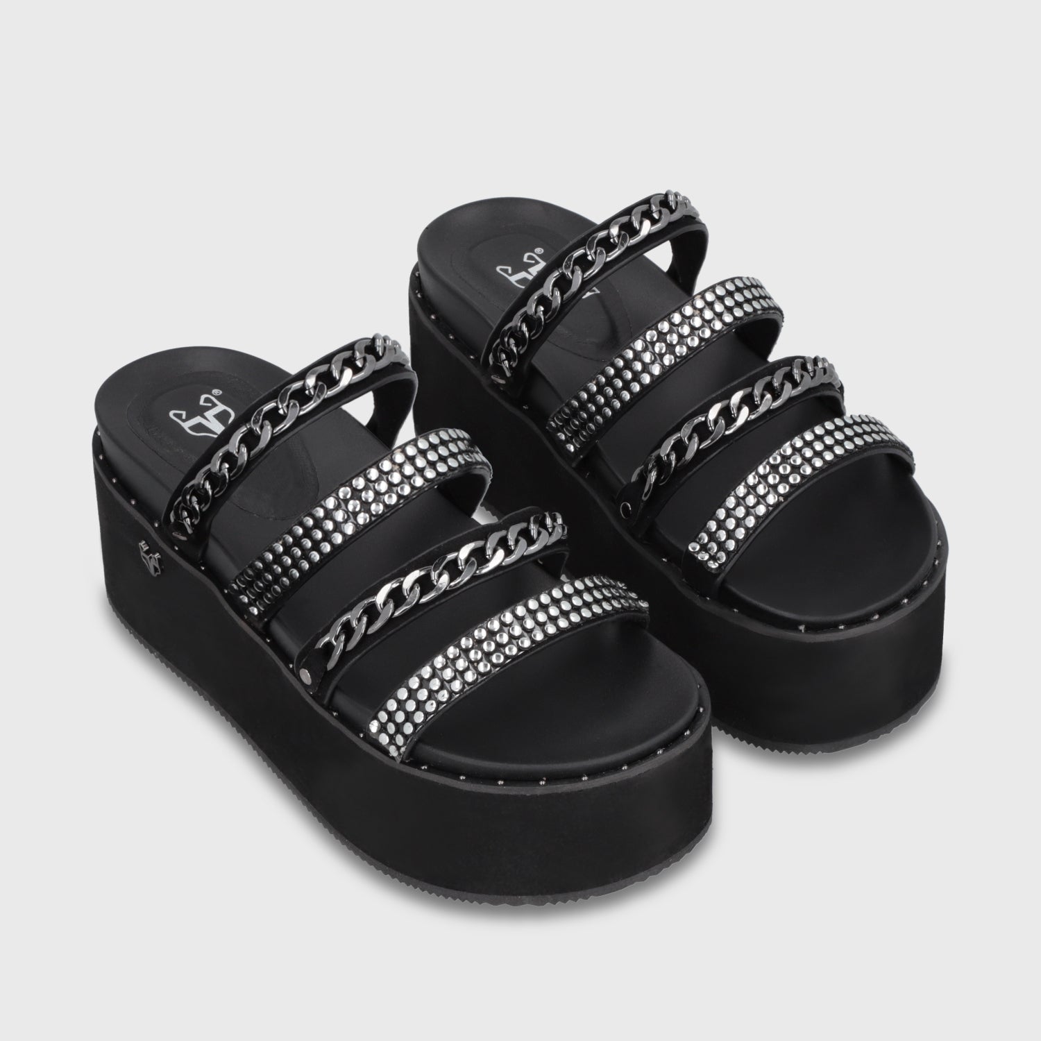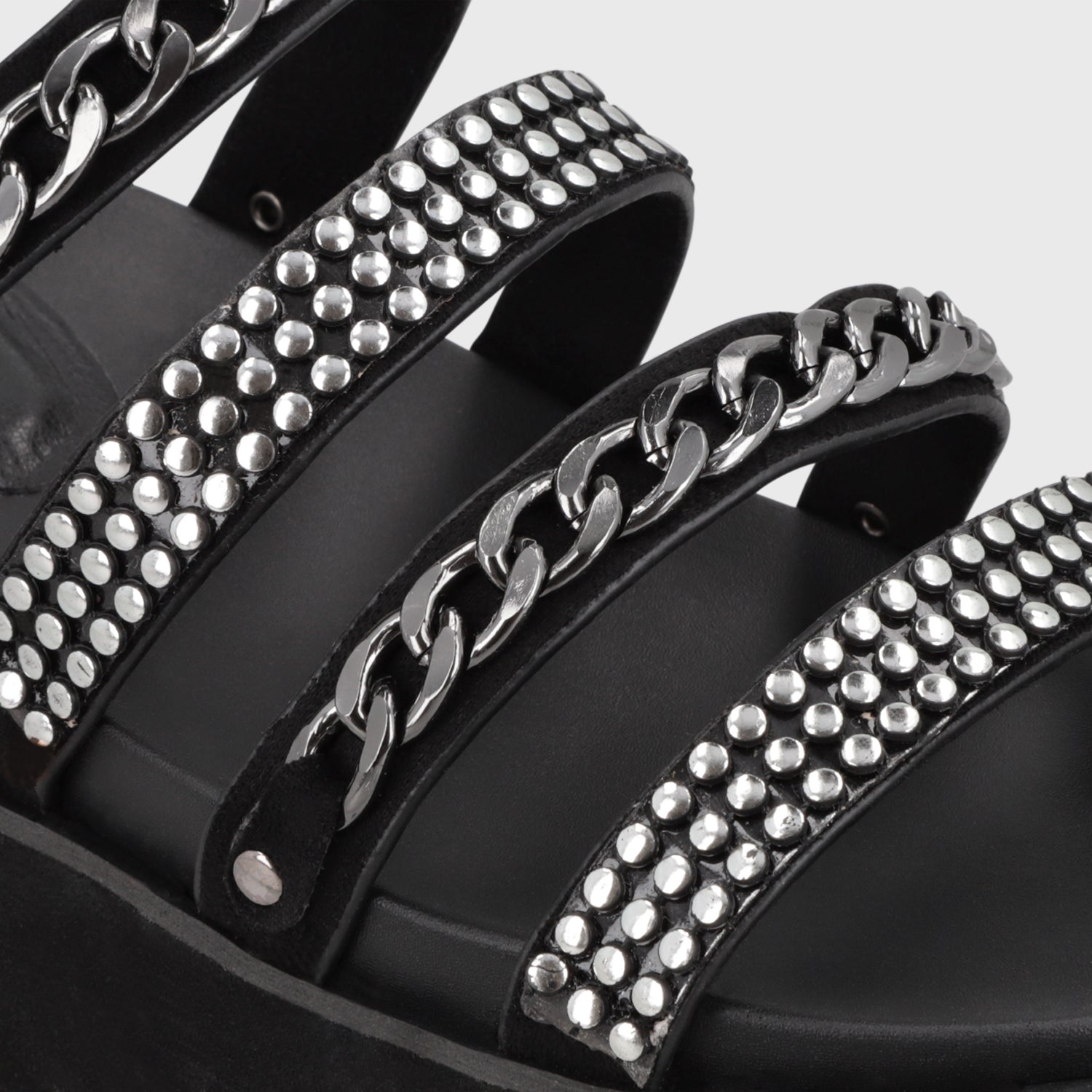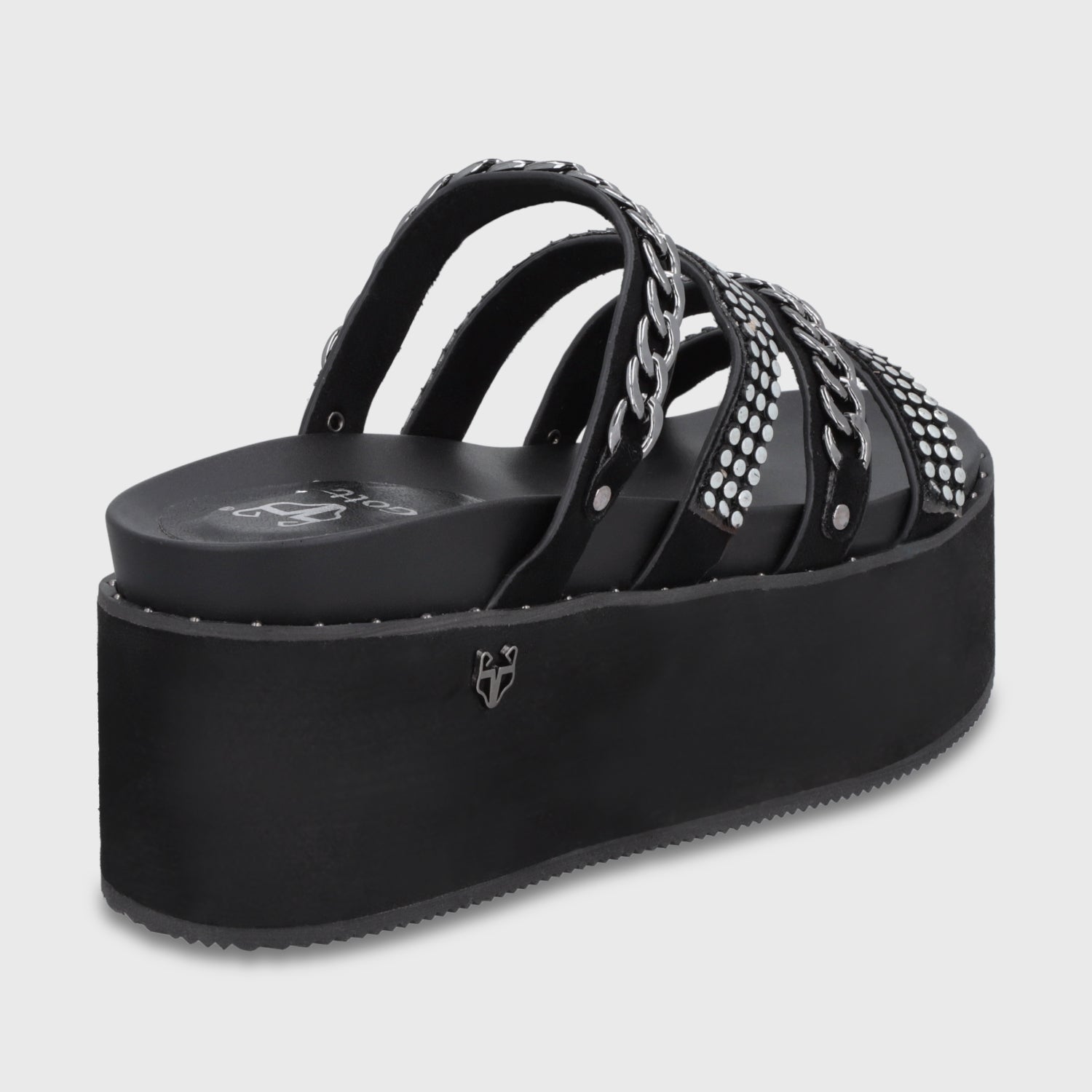 Sandalias de plataforma negras con tiras llenas de tachas y cadenas metálicas que gritan actitud y estilo. Perfectas para elevar tu look urbano con un toque rebelde, mientras disfrutas de la comodidad de su plataforma ligera. Llévalas con jeans rotos o un mini vestido negro para un outfit que no pasará desapercibido.