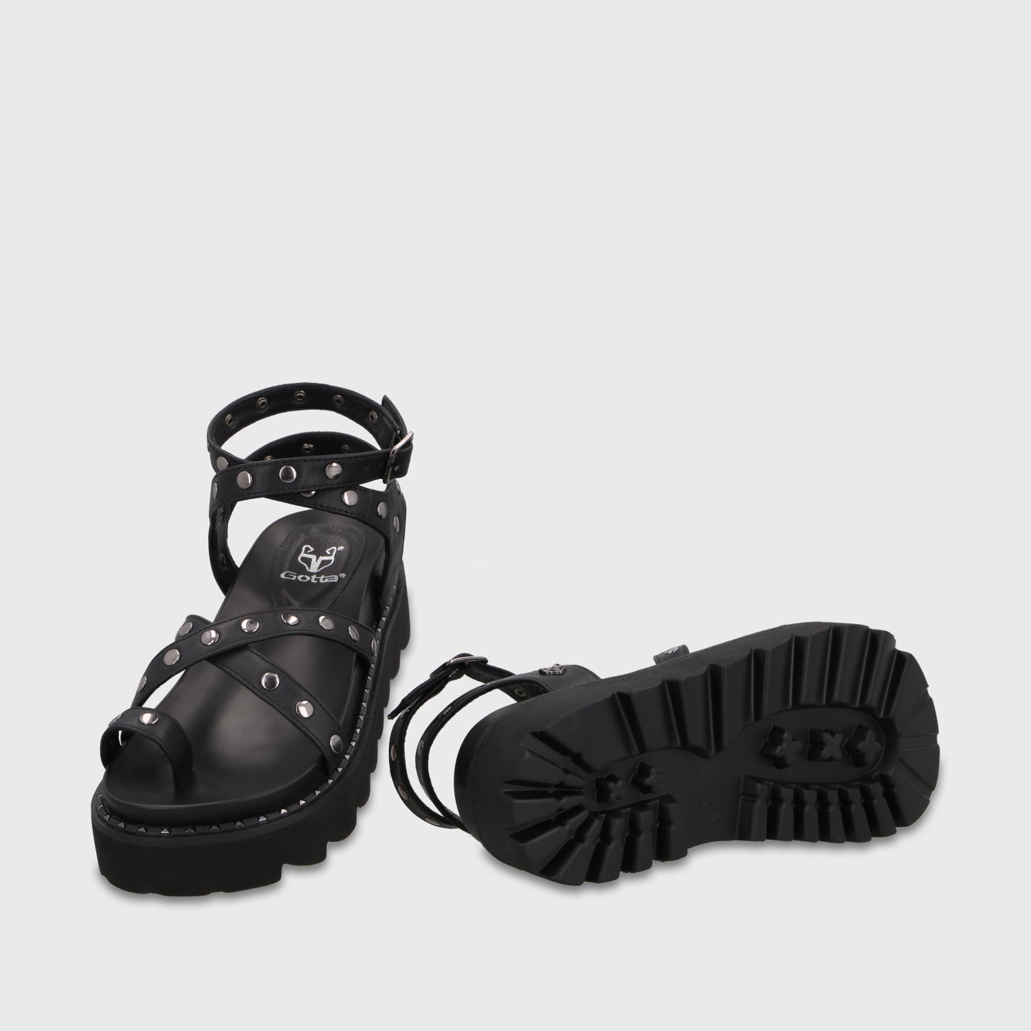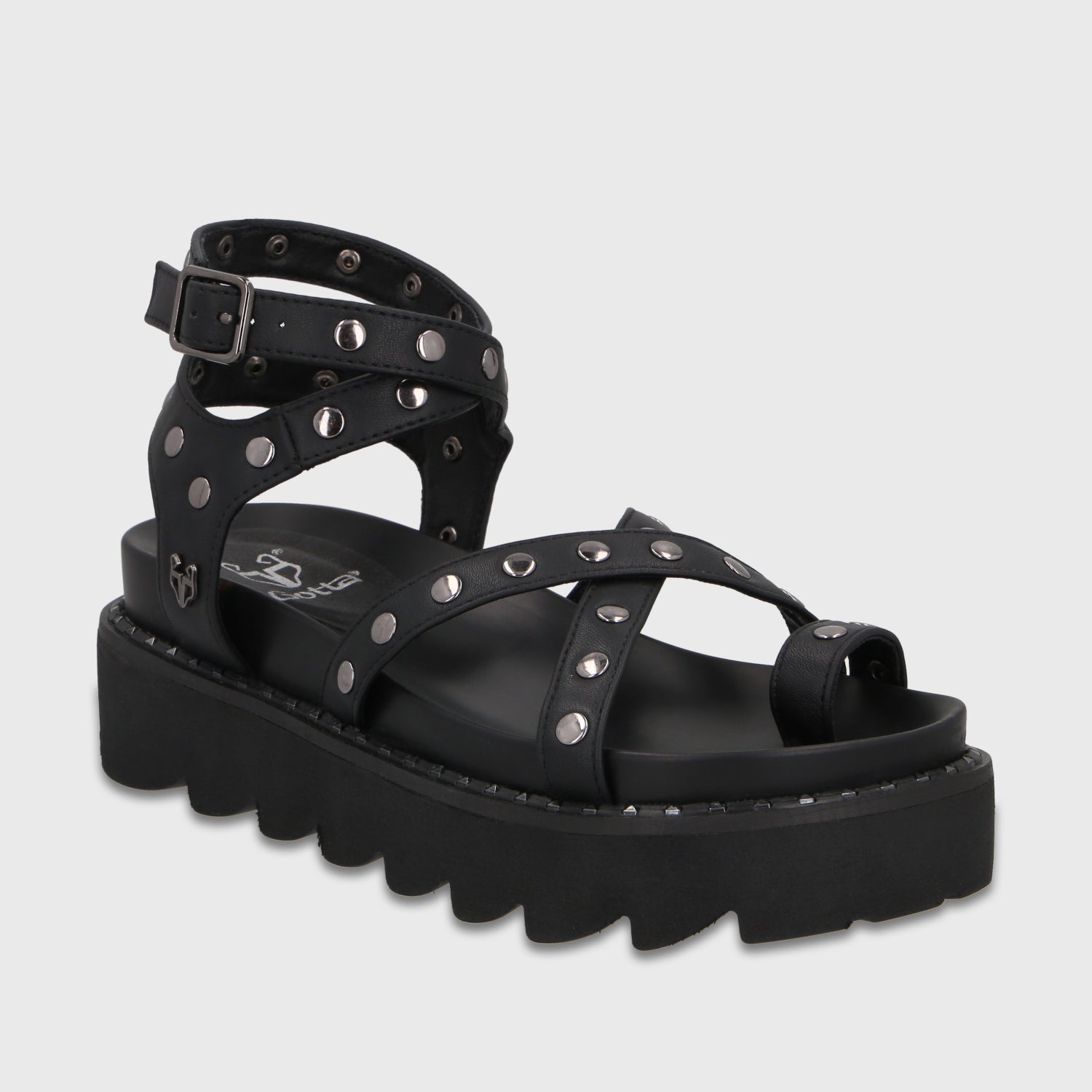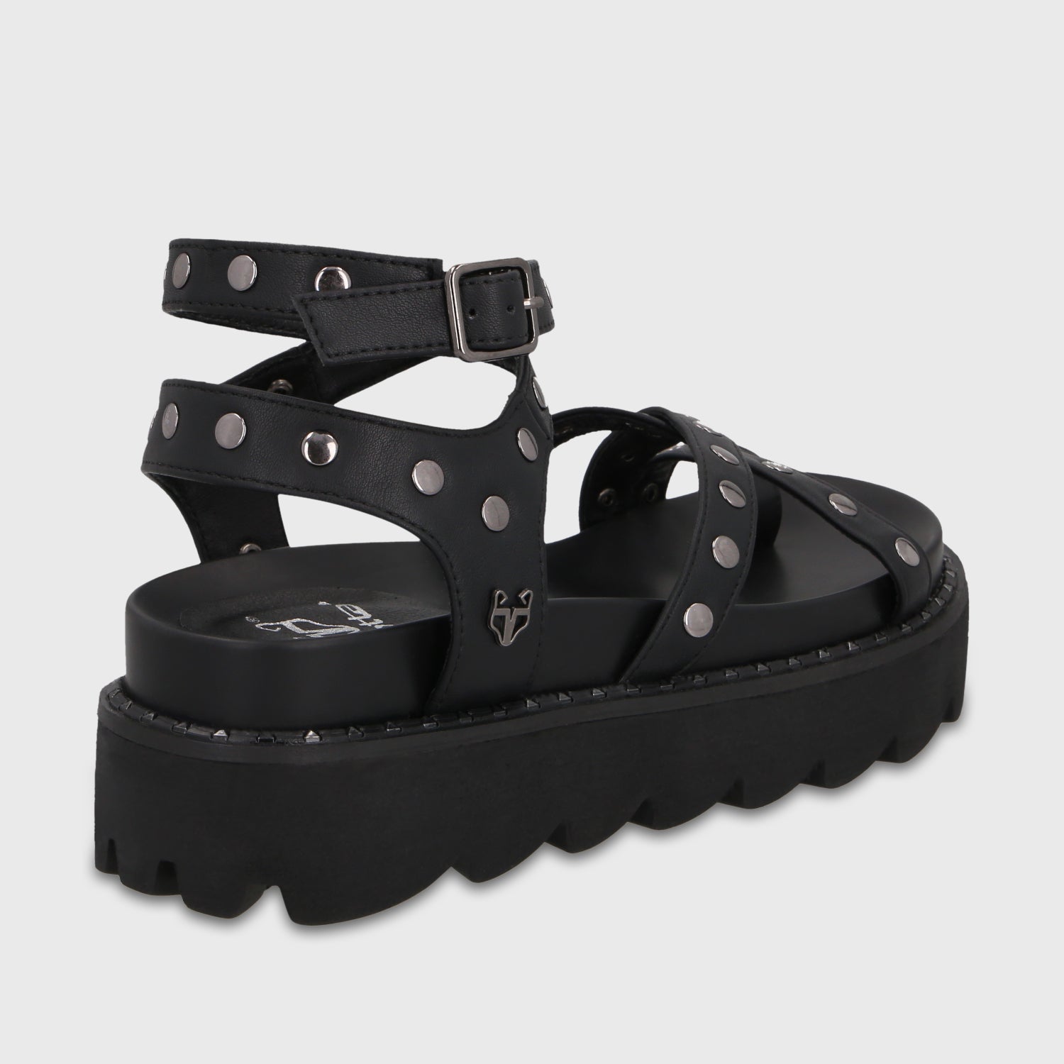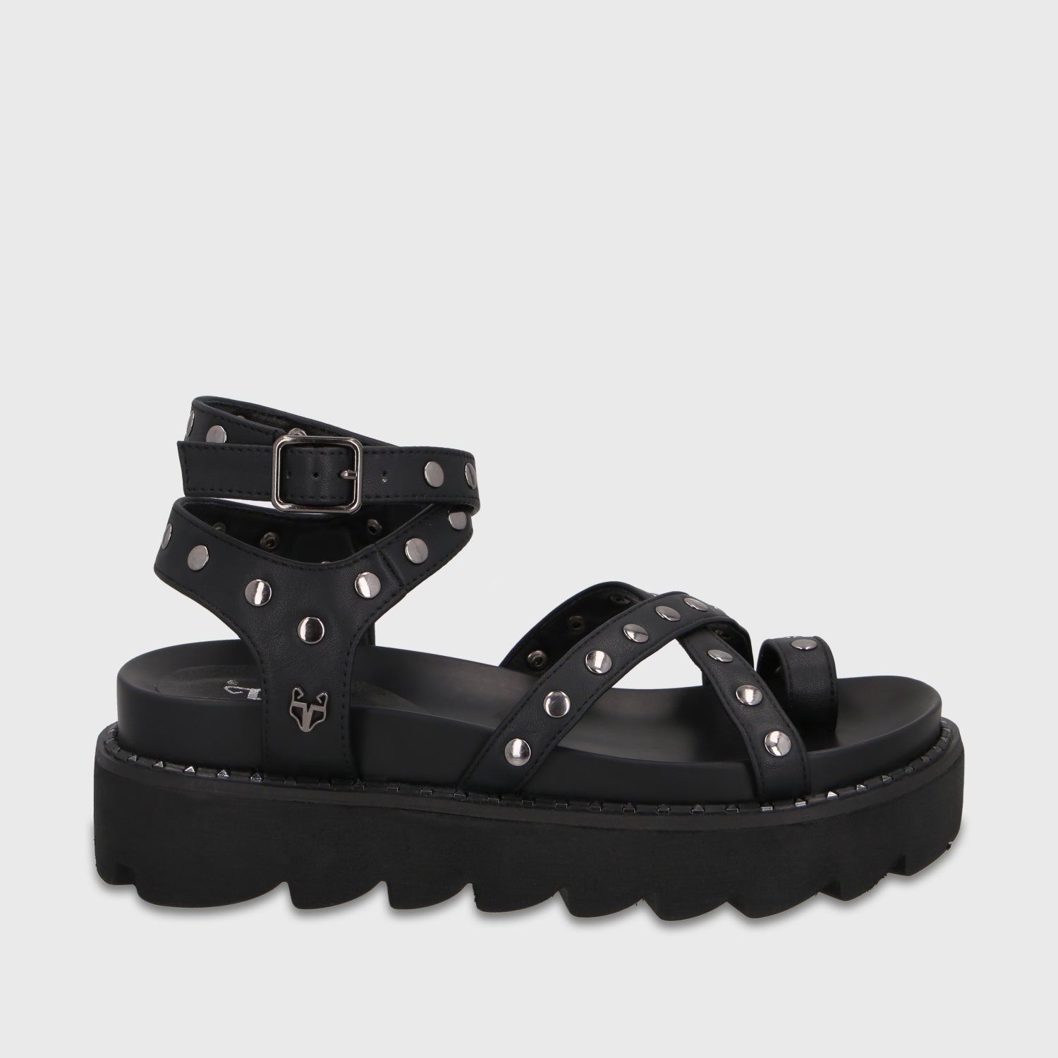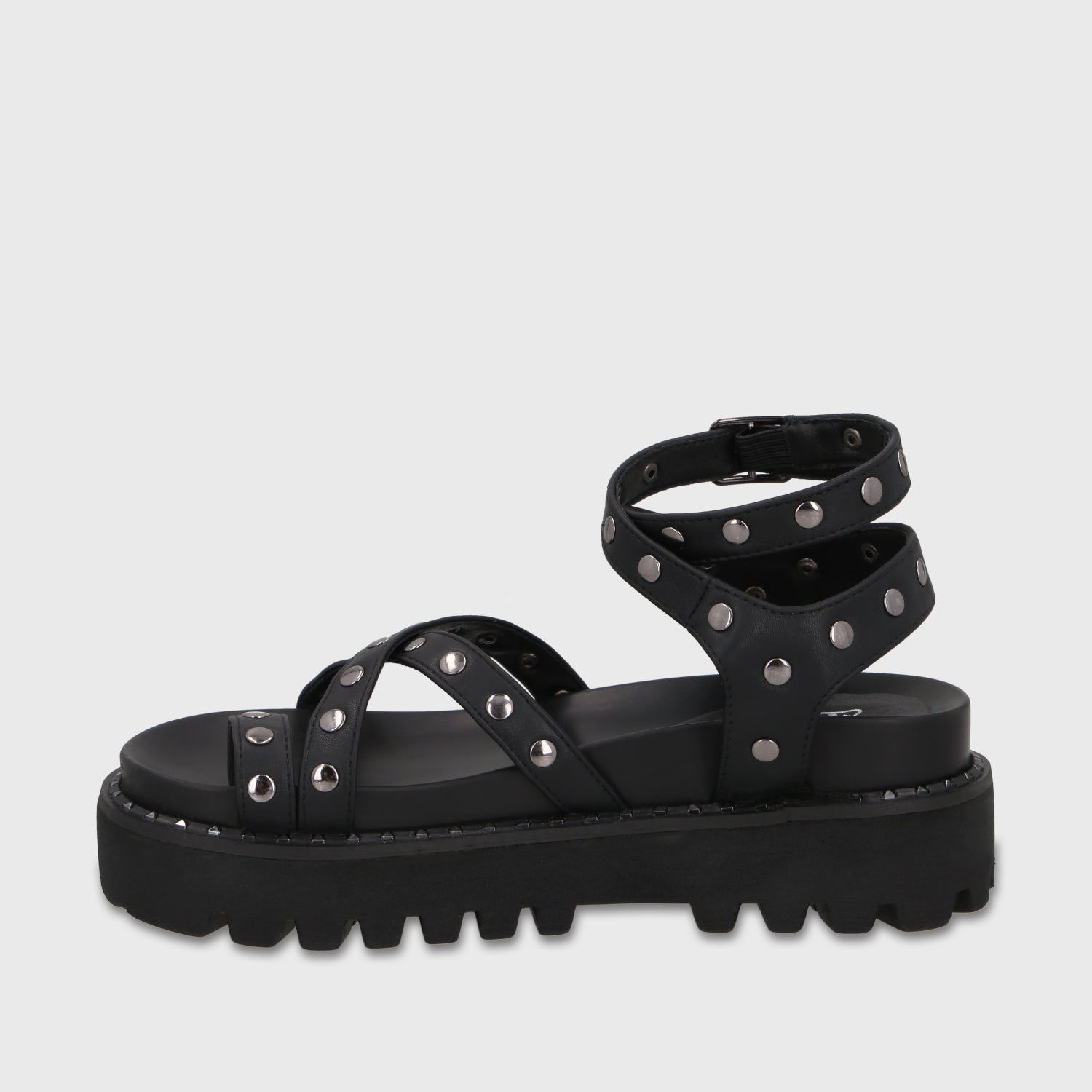 Sandalias negras con tiras cruzadas y apliques metálicos. Mix entre boho y rock chic.¡Un golpe de estilo en cada paso!Tip de estilo: Llévalas con kimono ligero o trench.