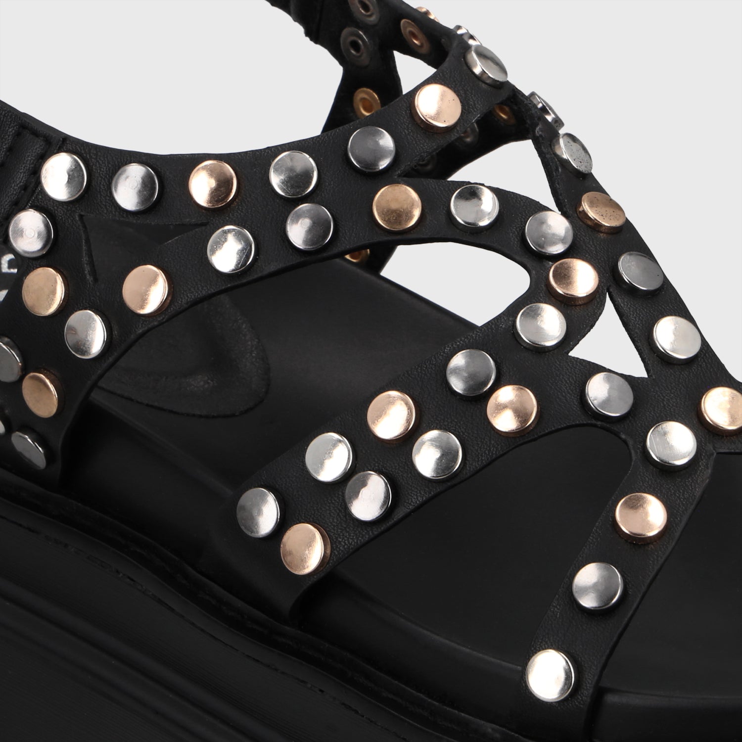 Sandalias negras con plataforma y studs bicolor dorado/plateado. Festivaleras y modernas. ¡Brilla de día o de noche!Tip de estilo: Combínalas con shorts de tiro alto y camiseta básica.