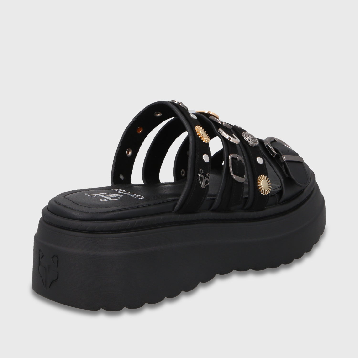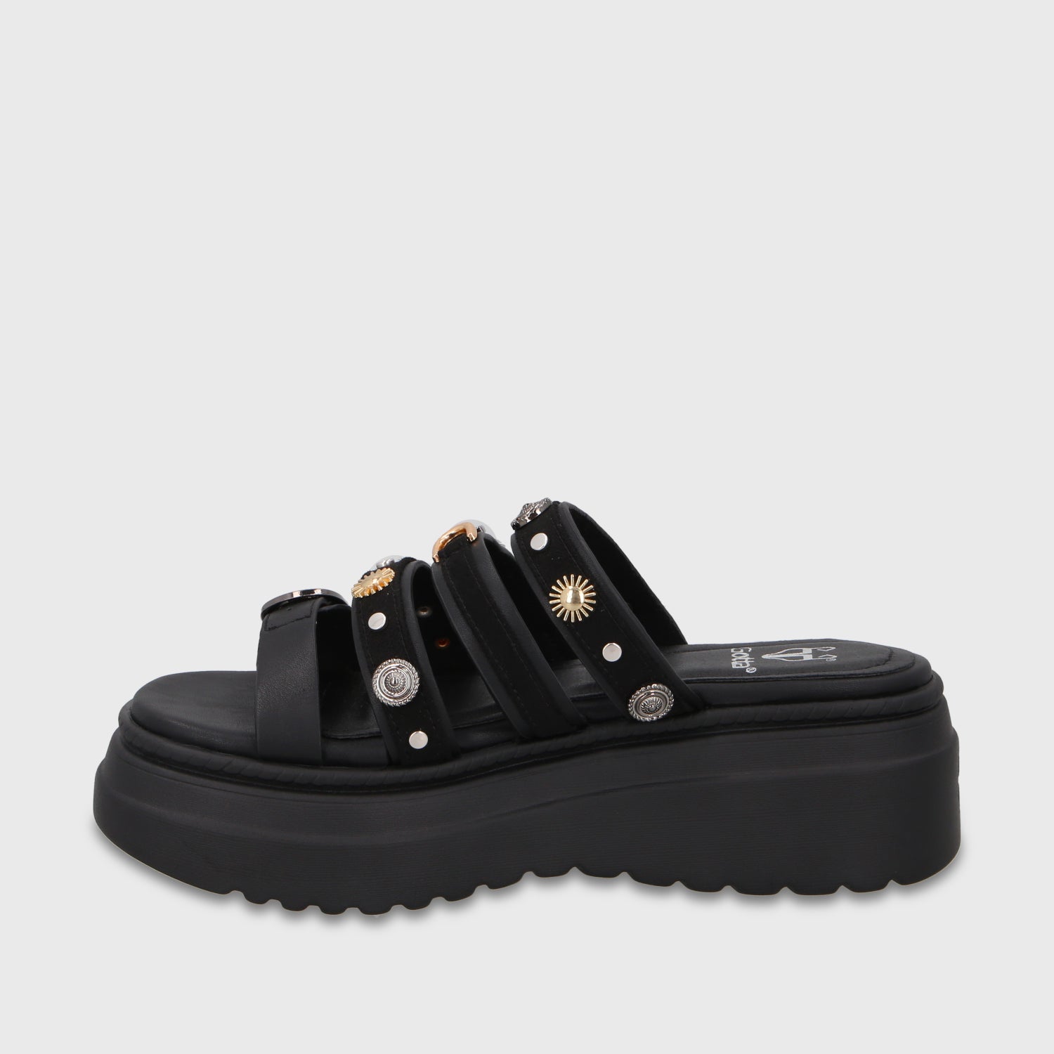 Sandalias de plataformas negras con tiras y detalles metálicos mixtos. Boho y rock en un solo par. ¡Deja que tus pies hablen por ti!Tip de estilo: Llévalas con vestido vaporoso o jeans flare.