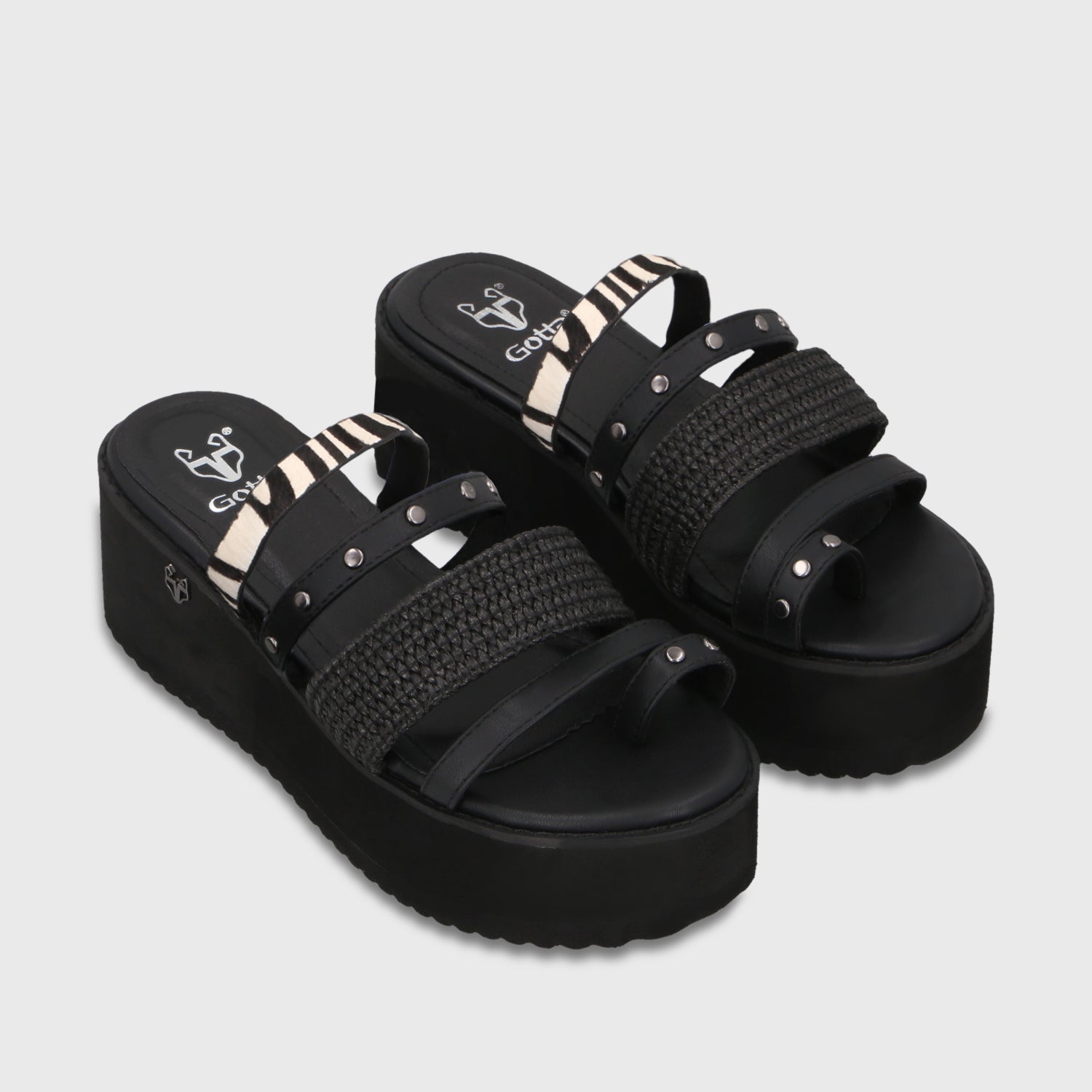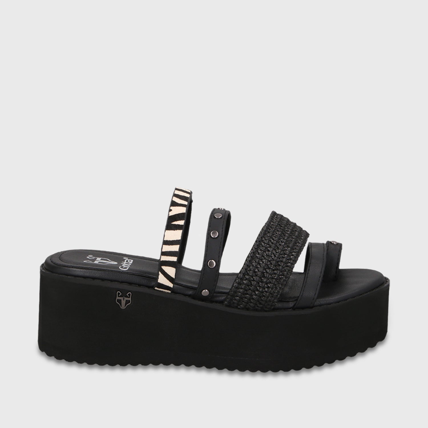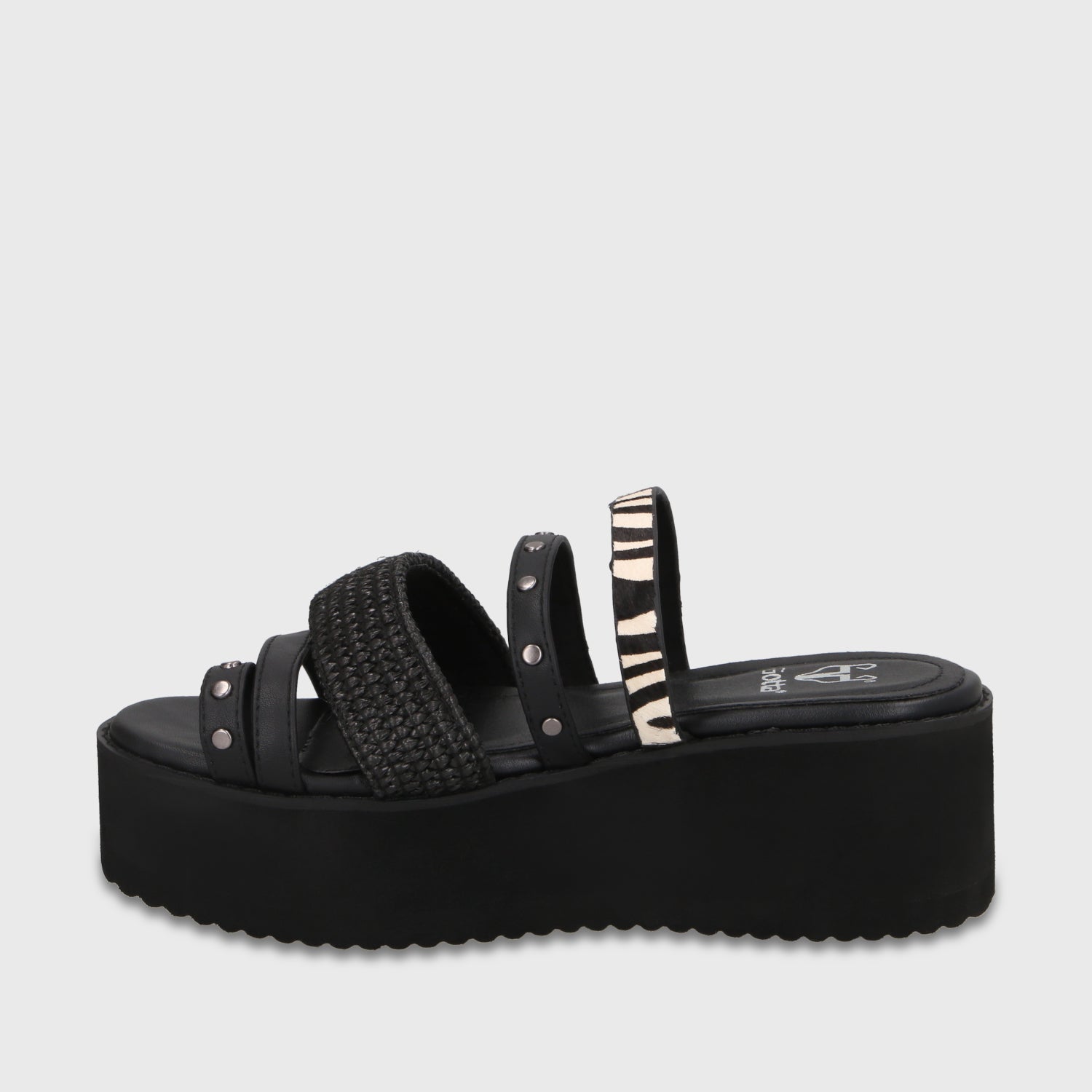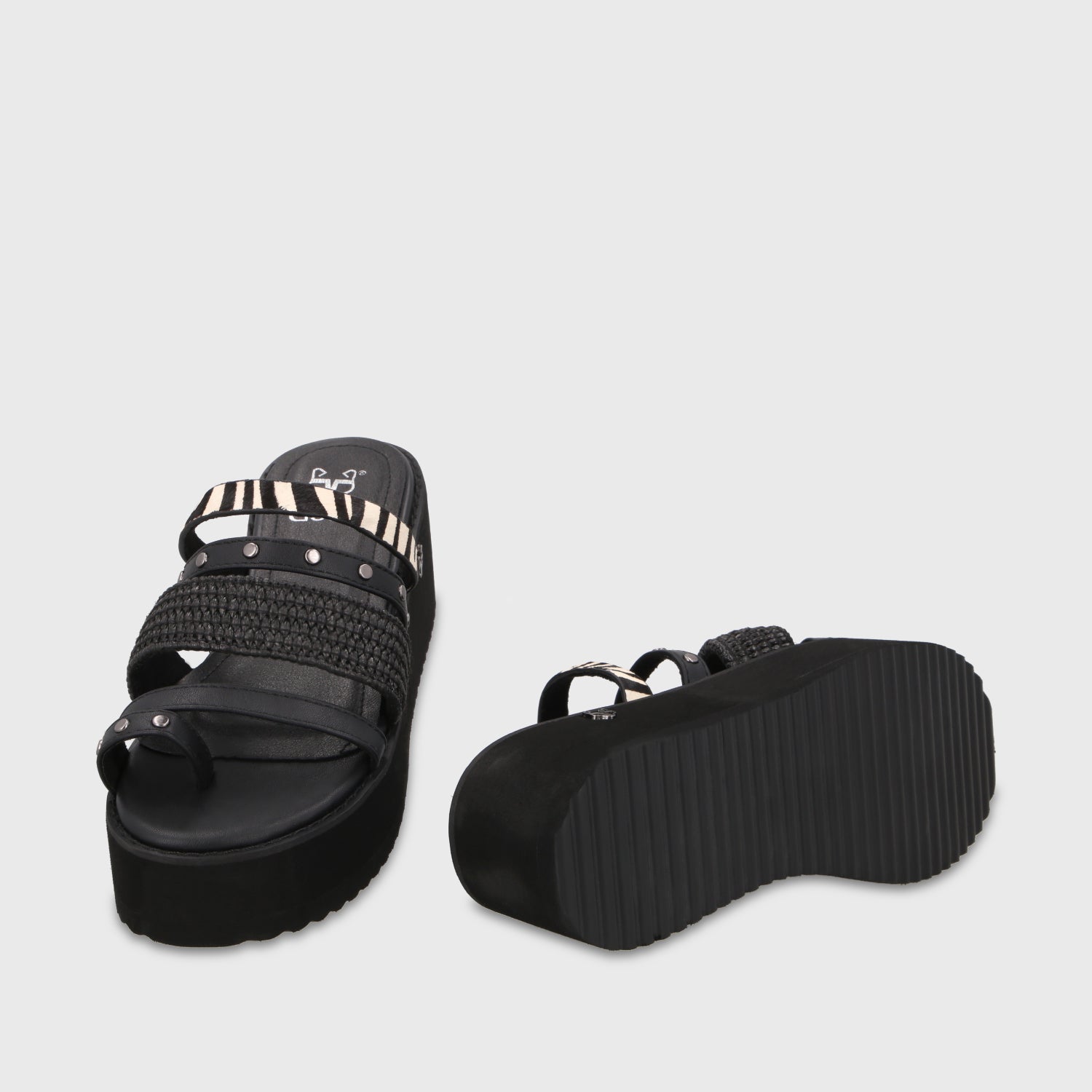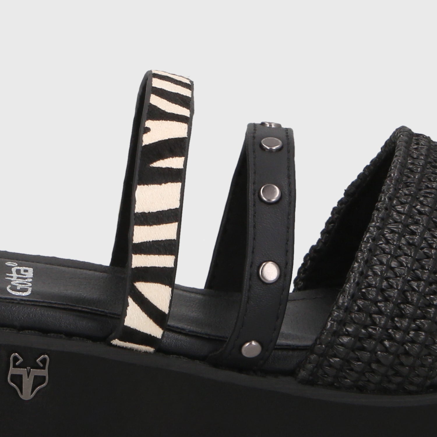 Sandalias de plataforma negra con tiras de rafia trenzada y detalle animal print. Bohemias y urbanas. ¡Brilla con estilo effortless! Tip de estilo: Pantalón palazzo beige y top minimalista.