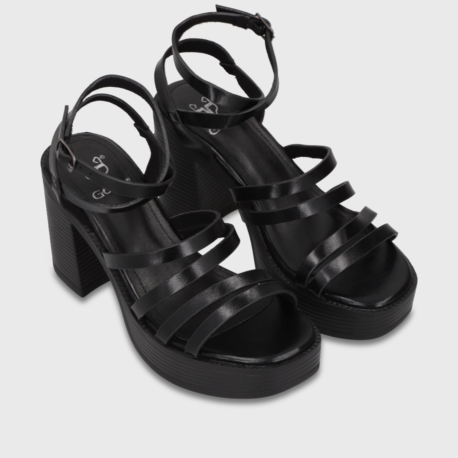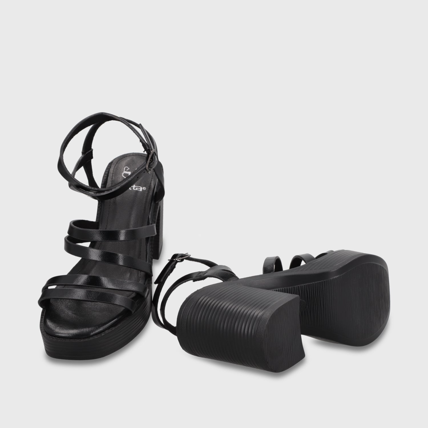 Sandalia negra con plataforma y tacón ancho, tiras cruzadas al frente y ajuste al tobillo, pensada para un look sofisticado y seguro. Úsalas con un slip dress satinado para la noche.